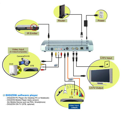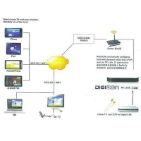 Product Description:DIGIZON 211 can support not only analog TV input but also other external video inputs such as DVD player, enabling users to watch TV at home and in distance via iPhone, iPad , and Android series!